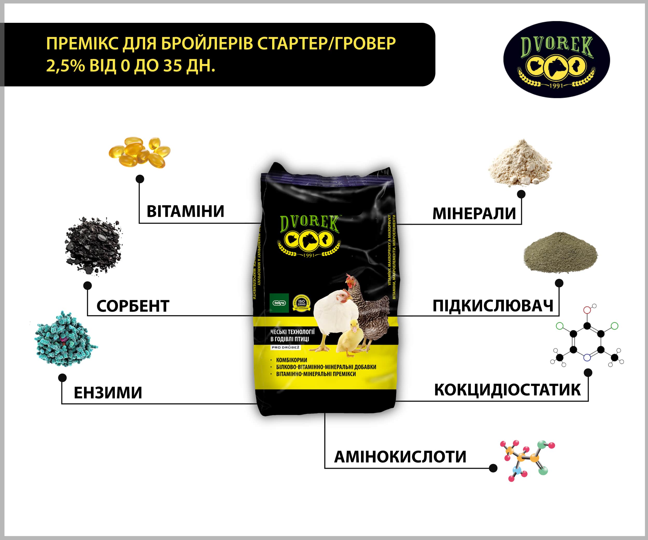 1 відгук Премікс Dvorek для бройлерів стартер/гровер 2,5% від 0 до 35 дн. – 25 кг