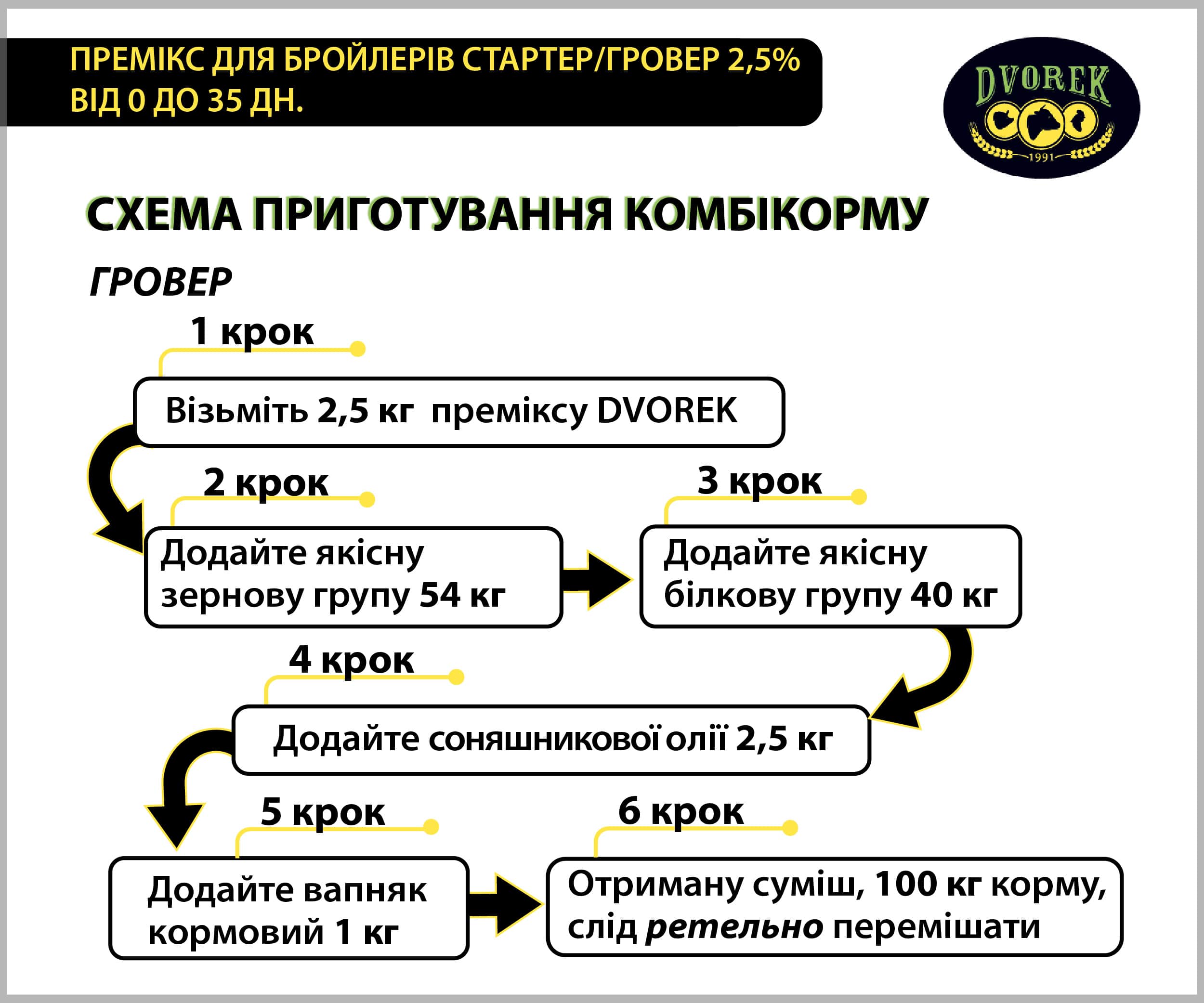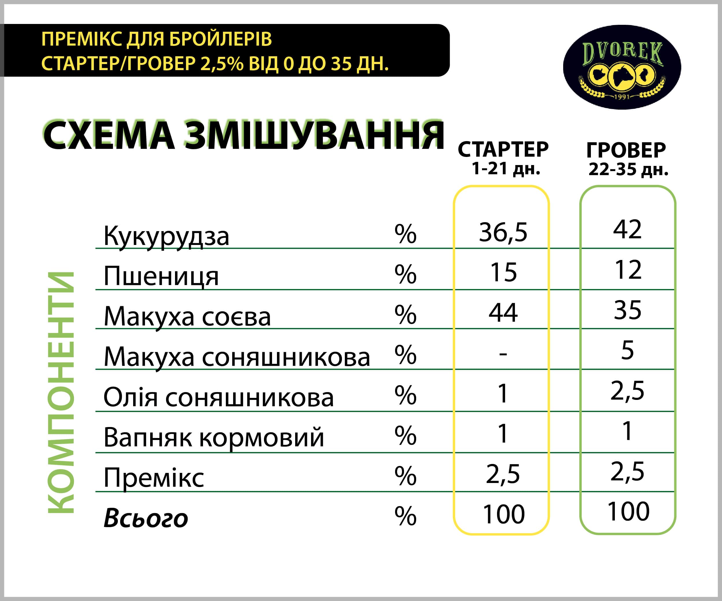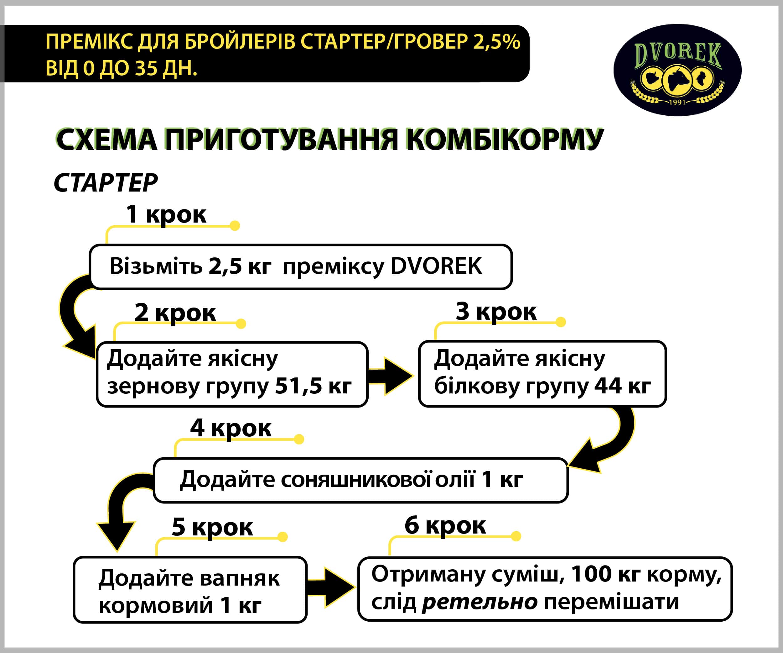 Премікс для бройлерів СТАРТЕР/ГРОВЕР 2,5% ТМ ДВОРЕК застосовують для приготування готових комбікормів разом із використанням зернової групи та білкової сировини рослинного походження, при цьому суміш потрібно добре перемішати. Згодовують приготовлений корм для бройлерів з 1 по 35 день. Вміст протеїну – 10,3%. Витрати преміксу на 1 голову становлять 90 г. В результаті отримуєте здорового, міцного бройлера з живою вагою 2,7 кг за 42 дні.
