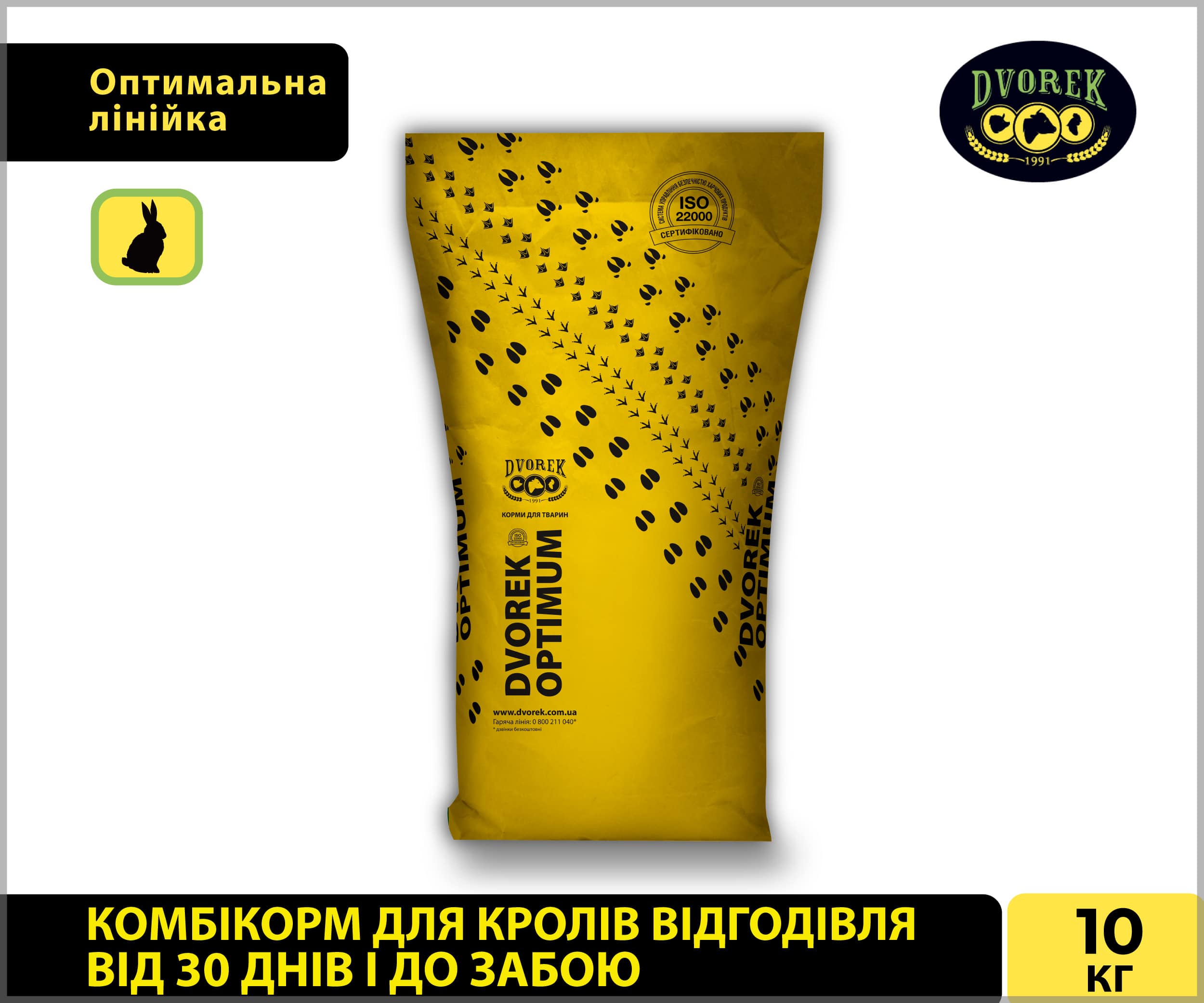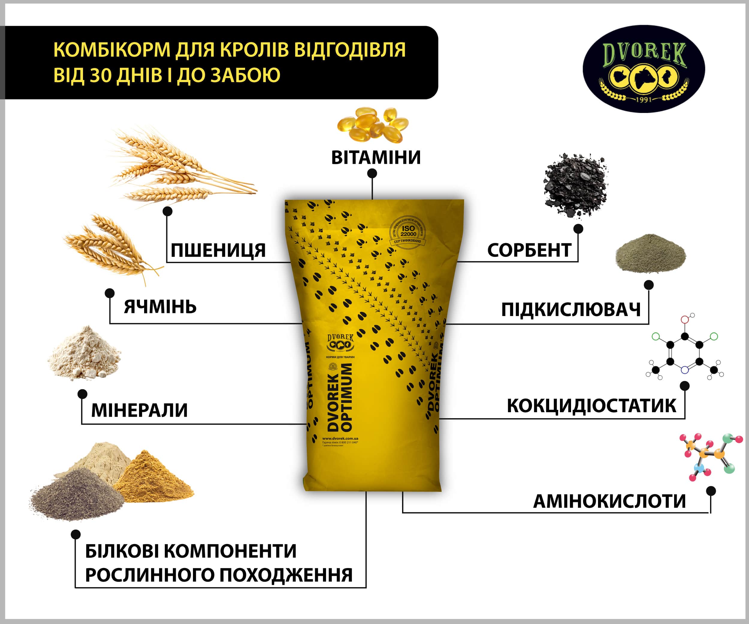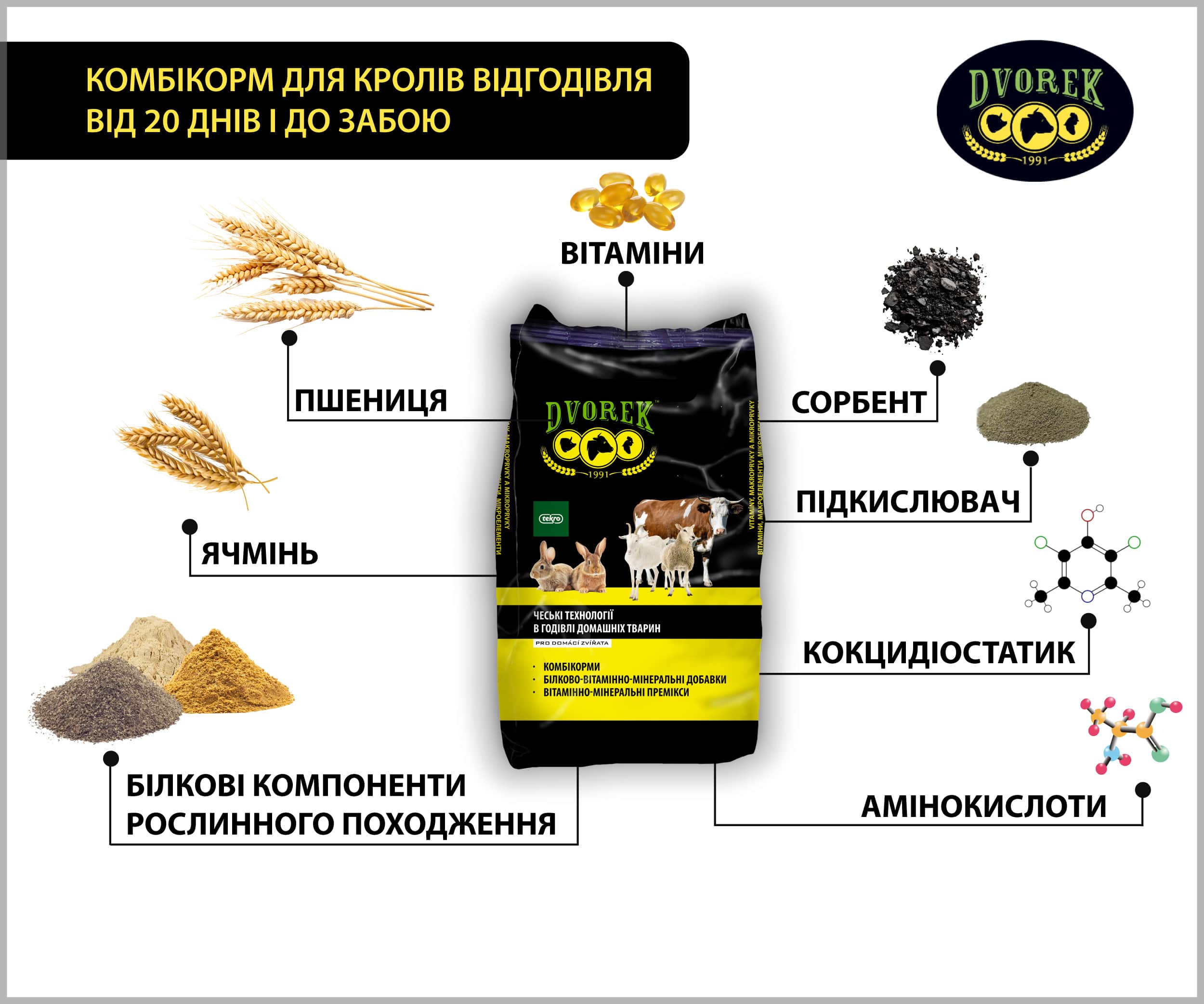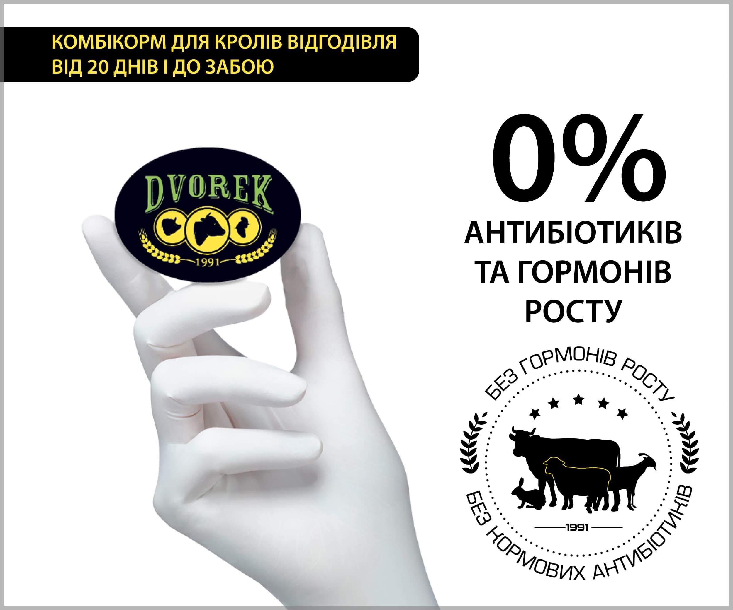 Комбікорм для кролів ВІДГОДІВЛЯ від 20 днів і до забою ТМ ДВОРЕК –  максимально збалансований за поживними речовинами і при цьому фізіологічно підходить для організму кролів. Корм має вигляд гранул, які досить міцні, що запобігає утворення пилу. В склад комбікорму входять: ячмінь, пшениця, білкові компоненти рослинного походження, амінокислоти, вітаміни, макро- та мікроелементи та інше. Всі компоненти комбікорму проходять лабораторний контроль перед використанням у виробництві, в результаті кінцевий продукт високої якості. Вміст протеїну 16,5 %.