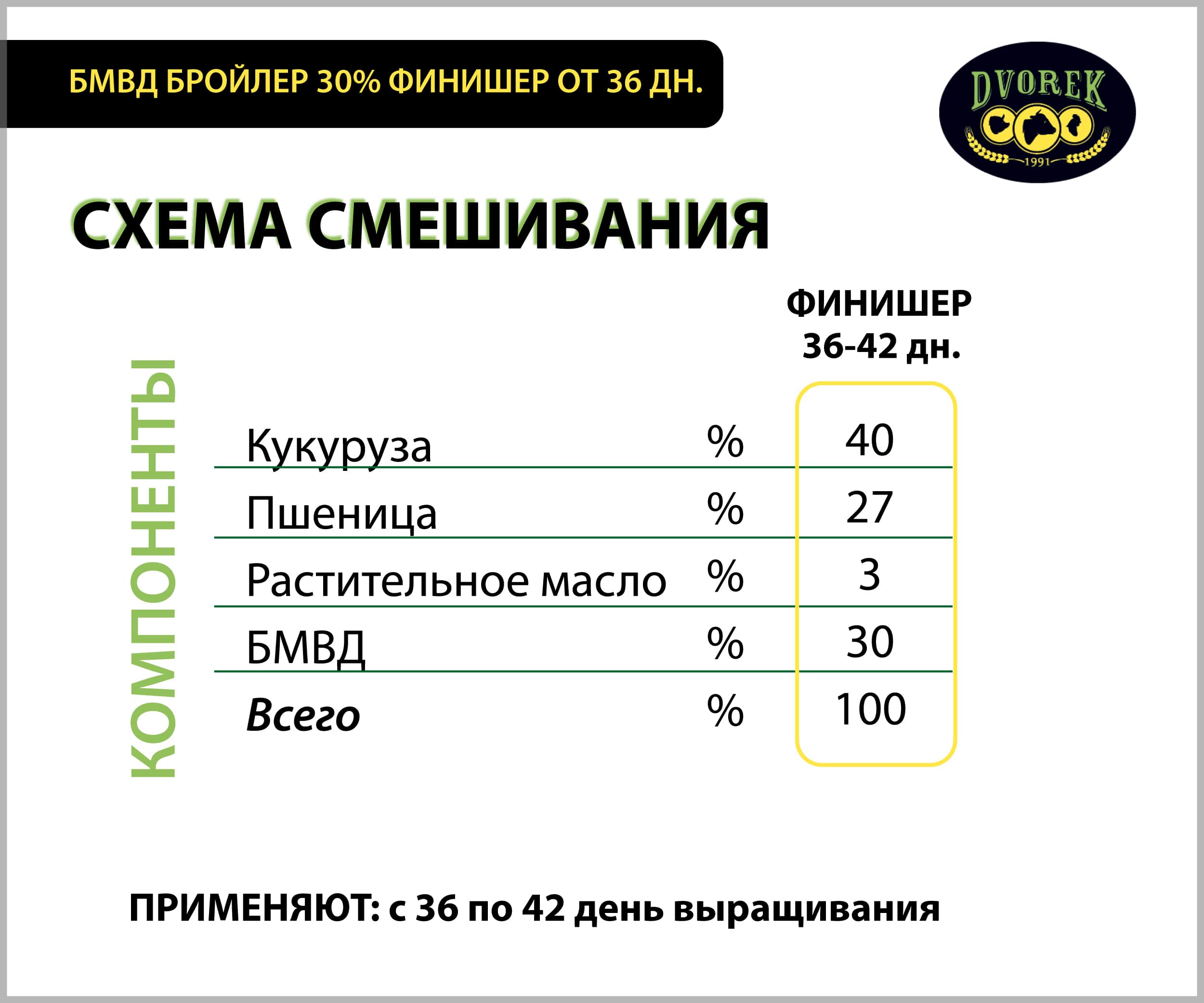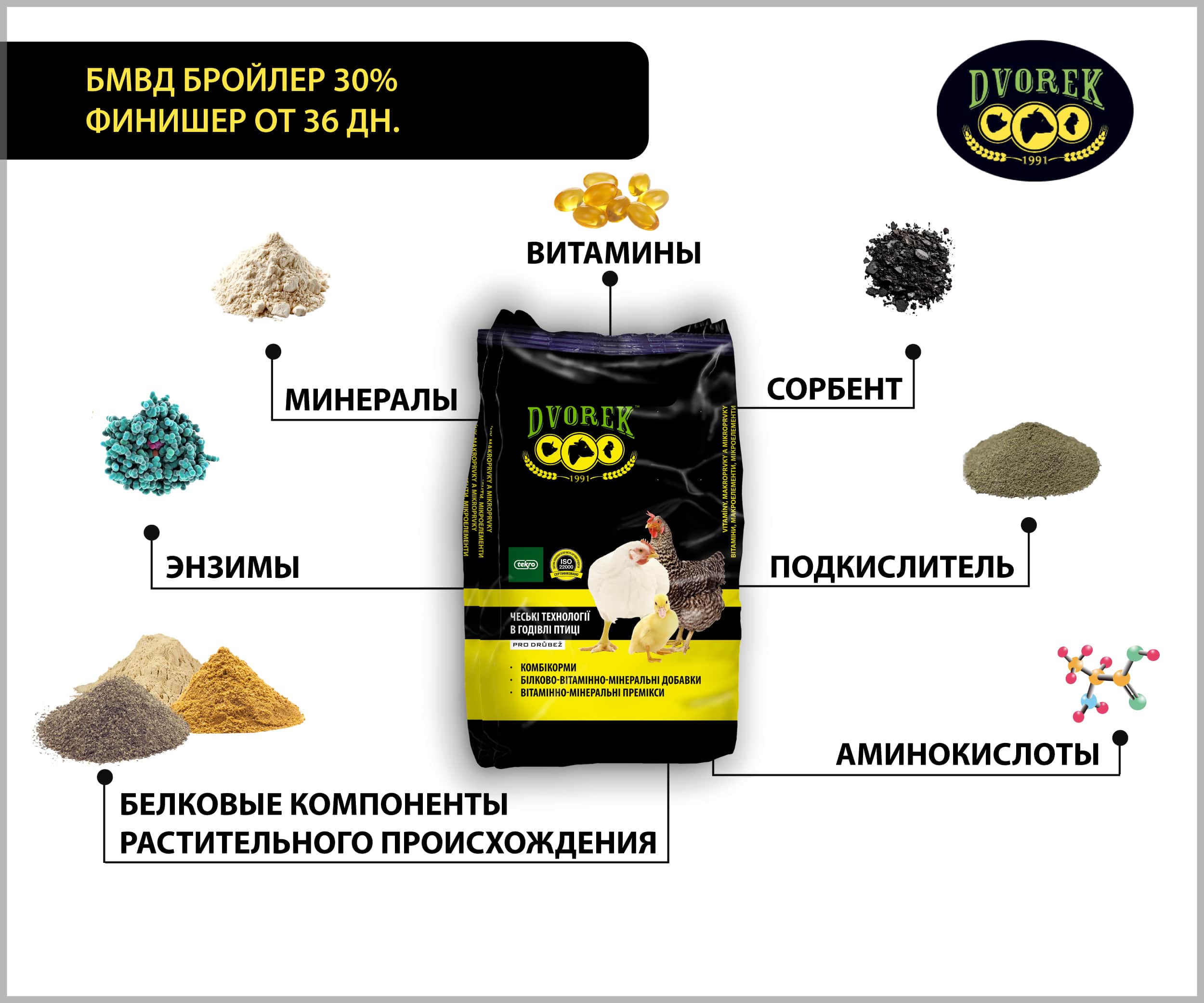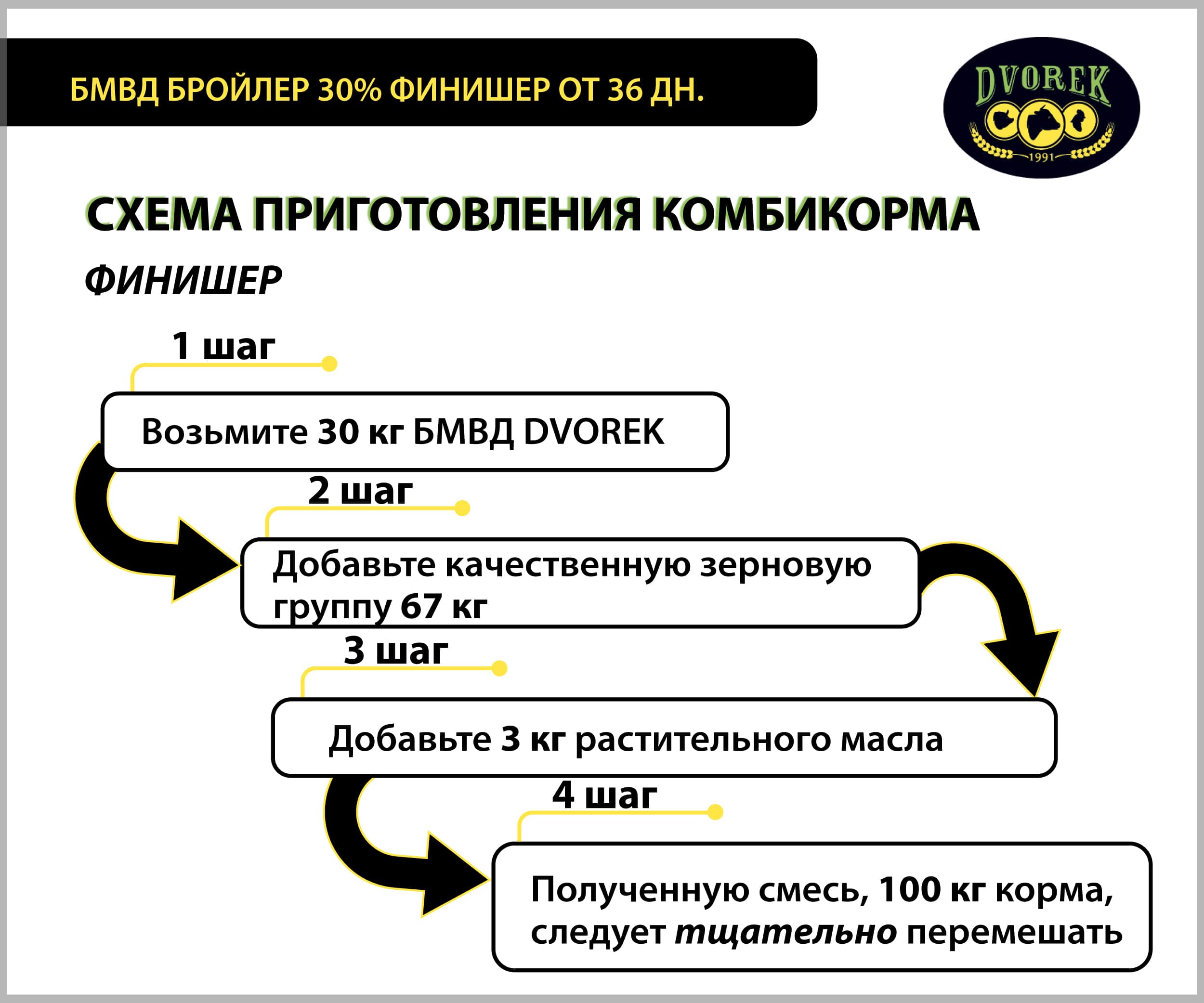 Приготовить комбикорм можно на основе БМВД для бройлеров финишер 30% ТМ ДВОРЕК в сочетании с зерновой группой.