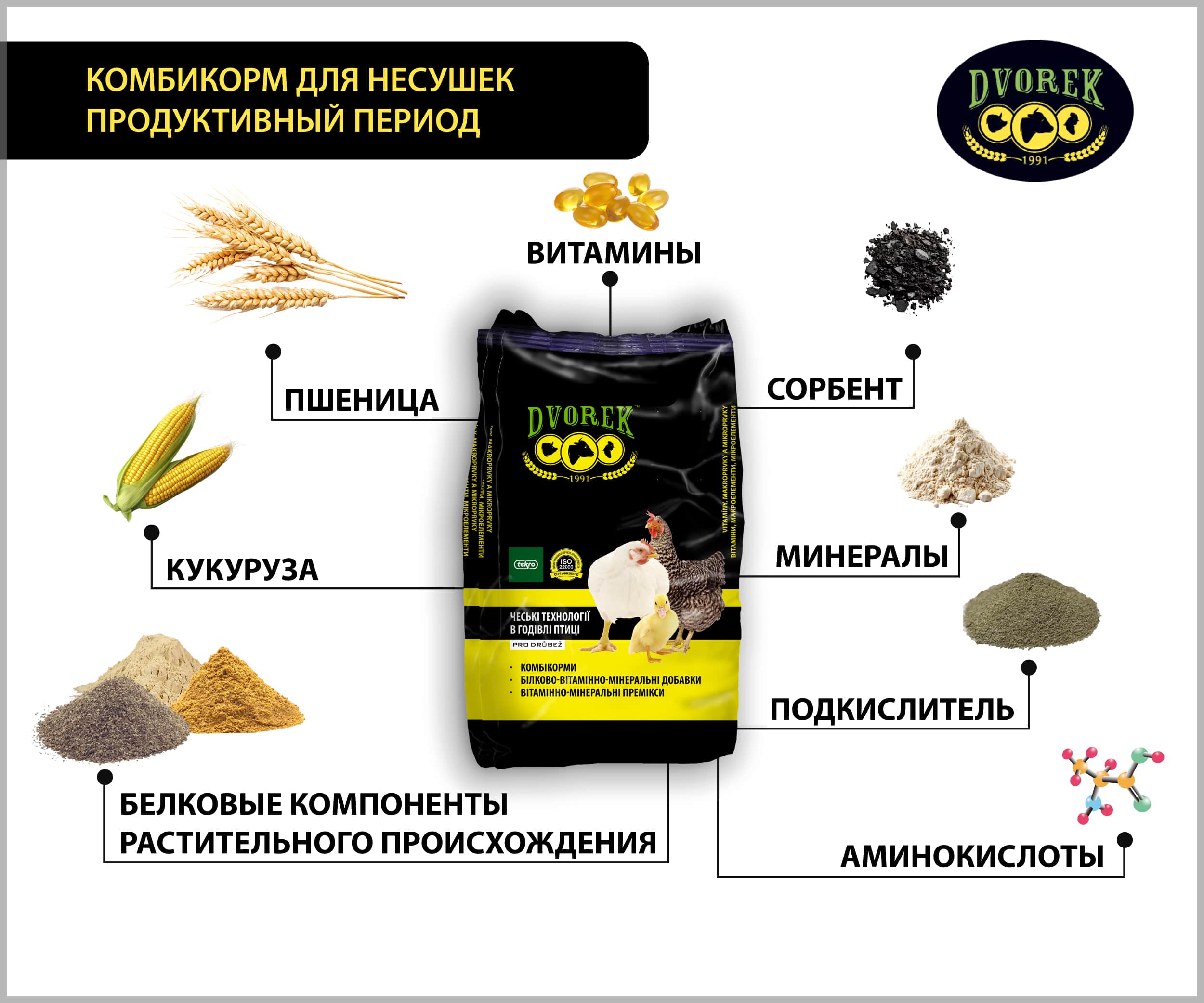 Чтобы обеспечить полным комплексом витаминов и минералов, а также повышение питательной ценности рациона и формирования богатого витаминами и микроэлементами яйца важно обеспечить кур достаточным количеством белков и жиров. Достичь этого можно благодаря комбикорму для несушек ПРОДУКТИВНЫЙ ПЕРИОД ТМ ДВОРЕК. Содержит протеина 16,5%.