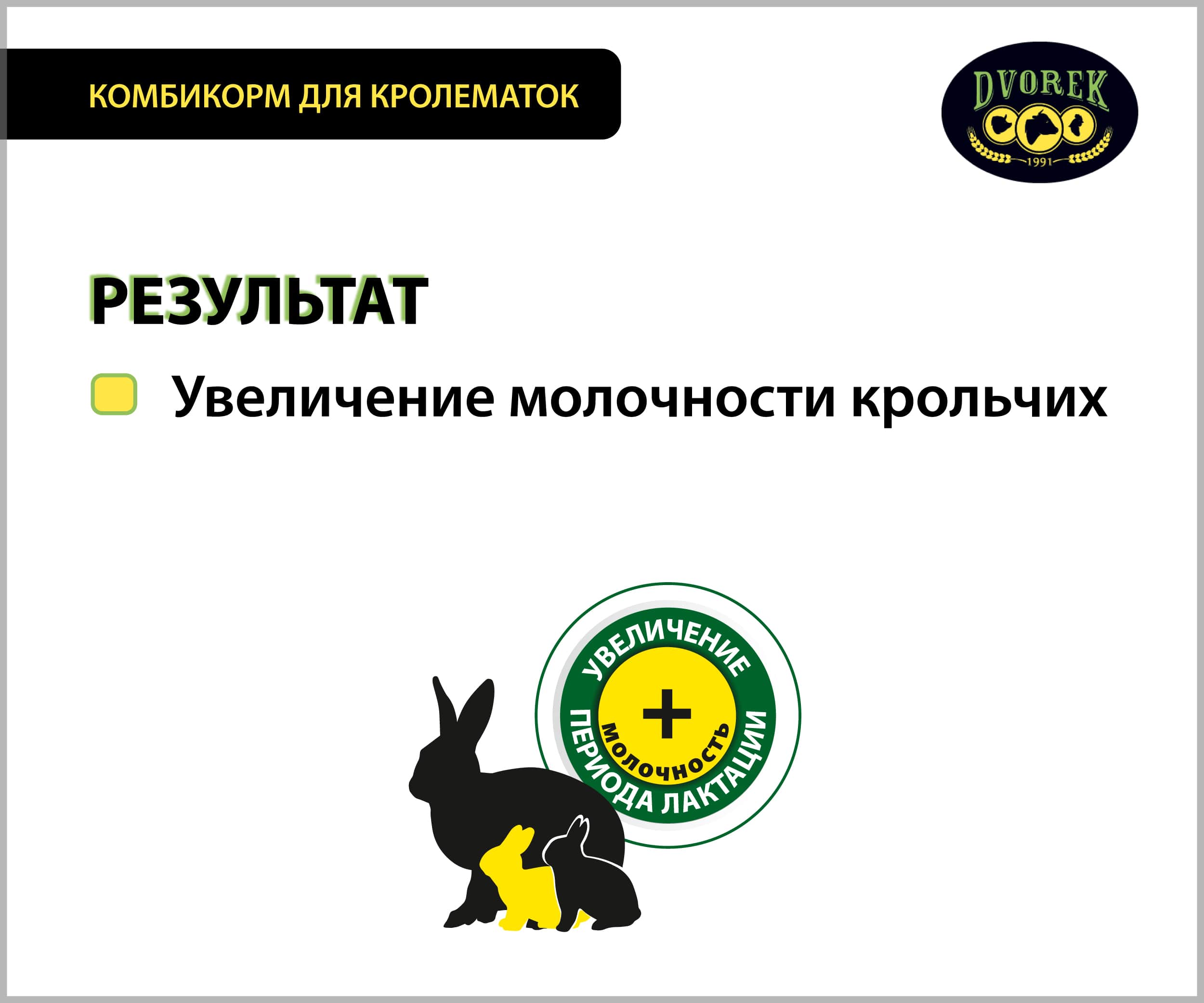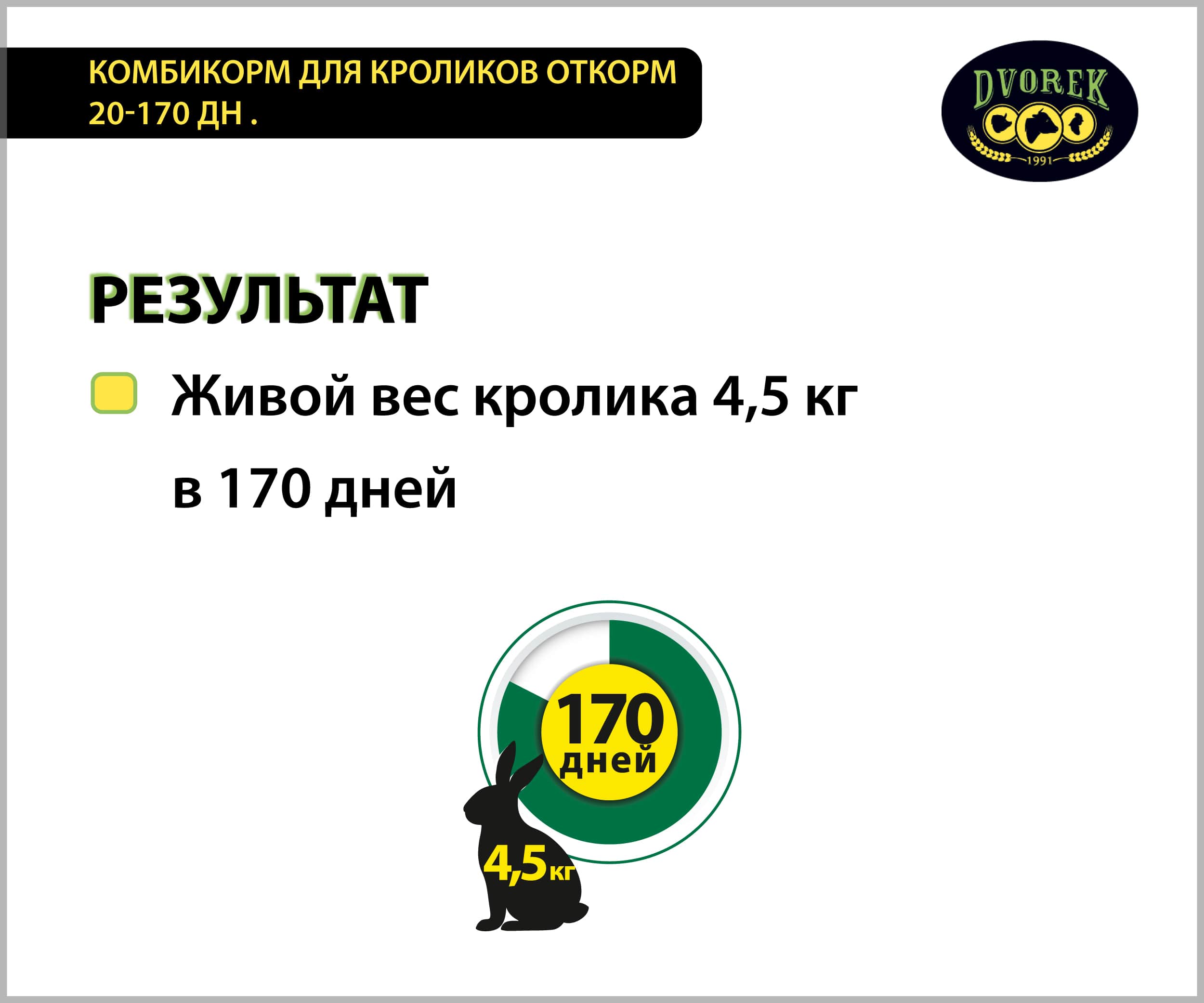 ТМ ДВОРЕК розробила лінійку комбікормів для кроликів.  В кормі  містяться всі необхідні вітаміни й мінерали, які сприяють швидкому росту тварин, а також набору ними ваги. Кролики їдять їх без різних додаткових речовин. В результаті: