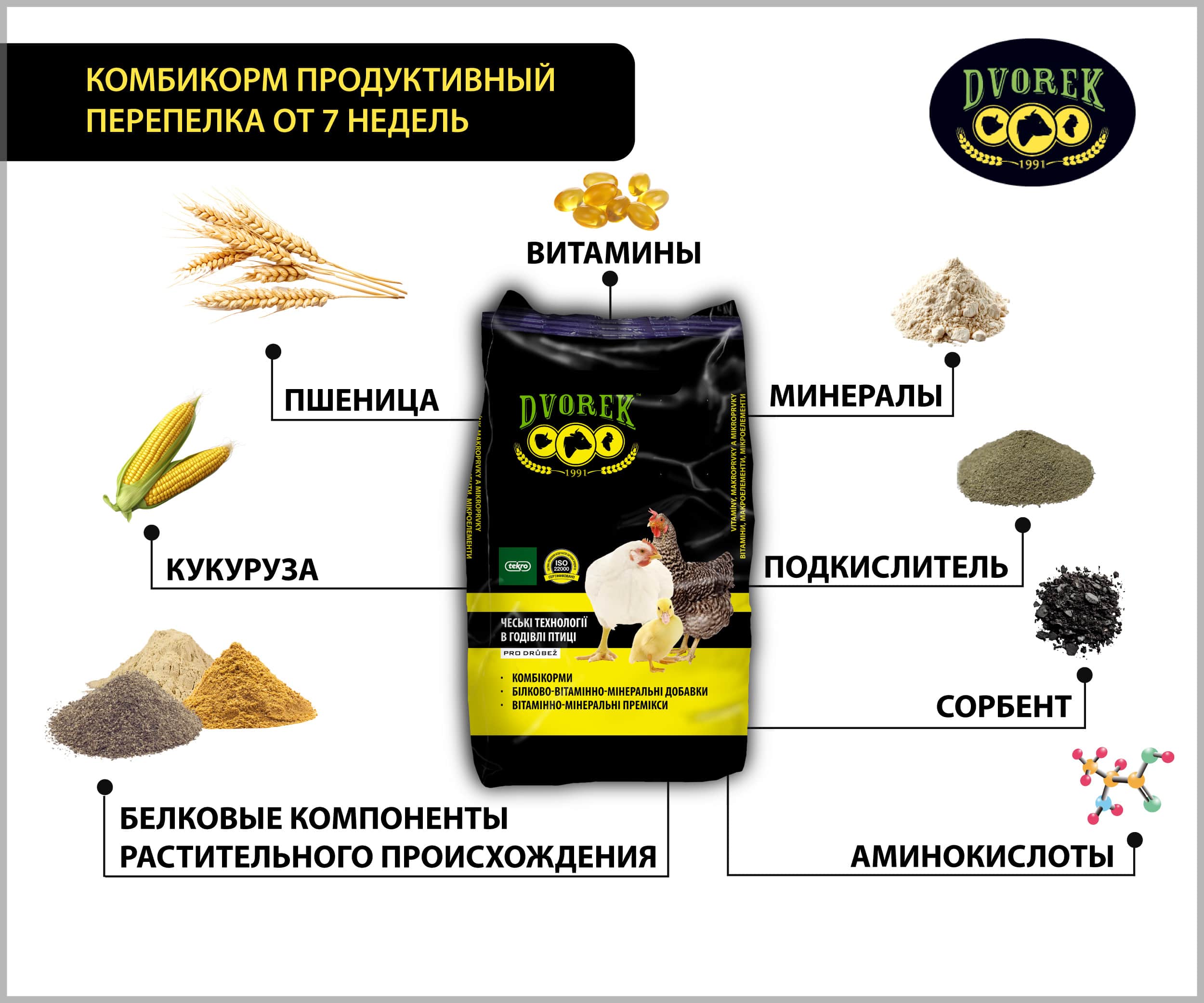 Специалисты ТМ DVOREK разработали линейку готовых комбикормов для перепелов. Комбикорма ТМ DVOREK обеспечивают перепелов всеми питательными веществами, витаминами, минералами на всех этапах роста.