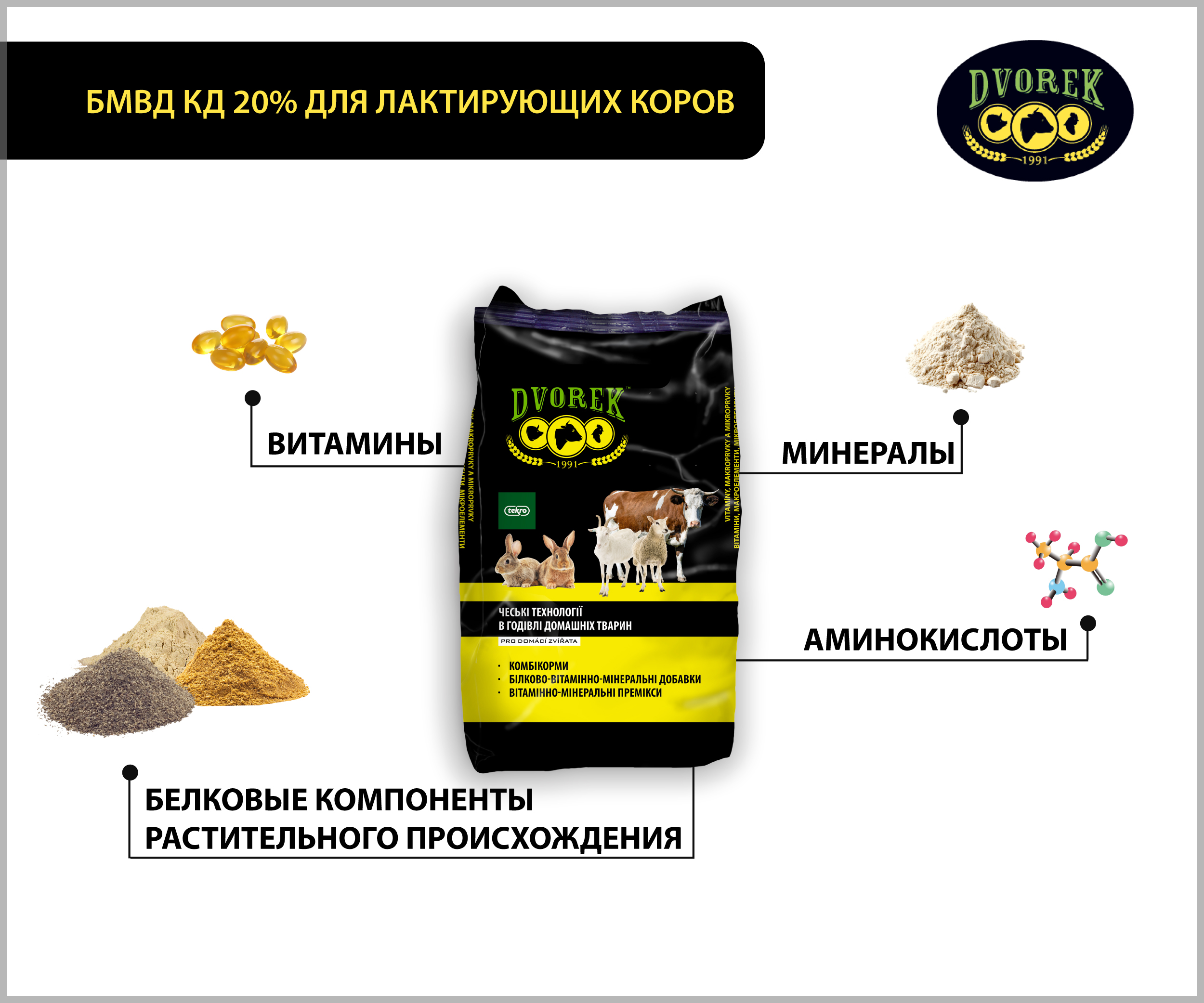 БМВД КД 20% для лактирующих коров ТМ ДВОРЕК – протеиновая добавка, сбалансированная по витаминам, минералам и другим питательным компонентам. В ее состав входят белковые компоненты растительного происхождения, витамины, макро- и микроэлементы, аминокислоты и тому подобное. Содержание протеина составляет 40 %.